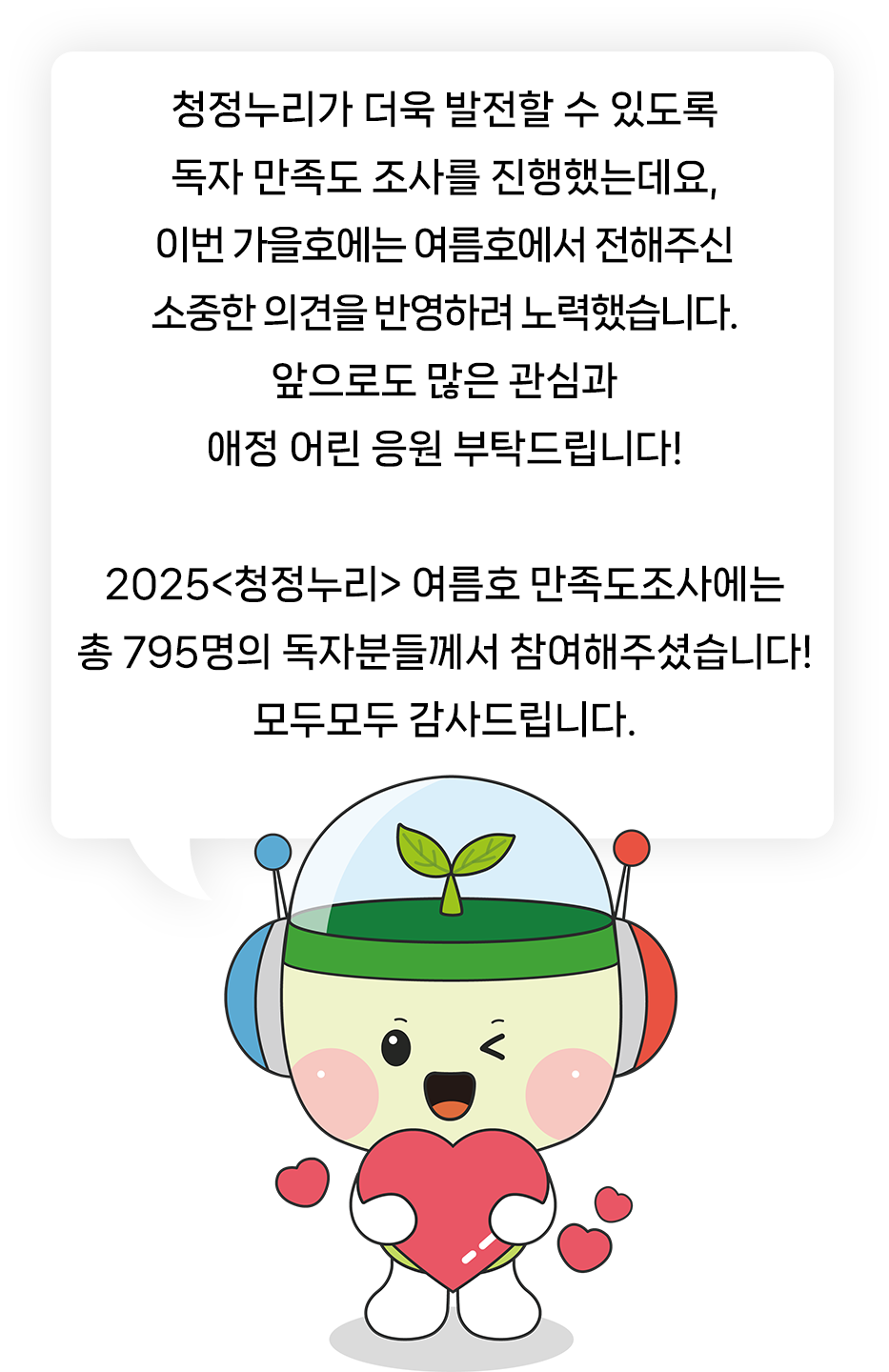 2025년 가을, 더욱 풍성해진 <청정누리> 가을호를 읽고 만족도 조사에 참여해 주세요!